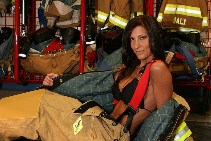 Girl in the form of fire. When viewing photos is hot. Especially the girls look crazy with a hose in his hand.